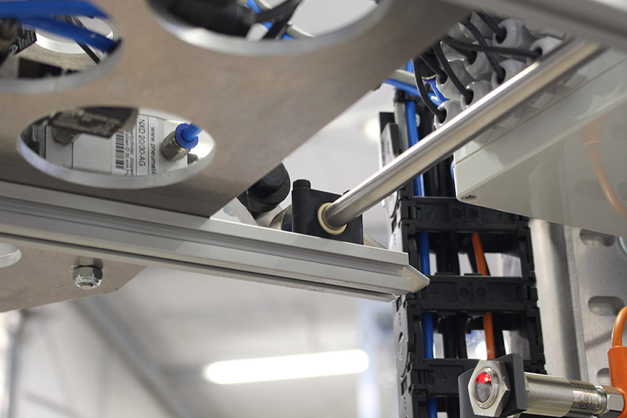 Keeping these requirements in mind, Langhoff built the machine with drylin® quad block carriages, which have solid plastic bearings and slide along two parallel shafts. He also used the igus® E4 e-chains® for energy supply. Both product lines have been used at Superwurm for a decade, without maintenance or repairs. The machine picks up the containers with a compressed air gripper, where the drylin® carriages serve as bearing points for the movable elements.