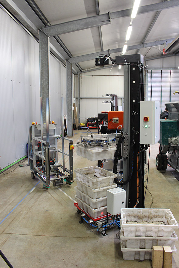 Looking to enhance his technology even further, Langhoff developed machines to fully automate the feeding and watering process. Two robots, a conveyor belt and an AGV now take care of monotonous feeding and watering steps that previously had to be done by personnel.