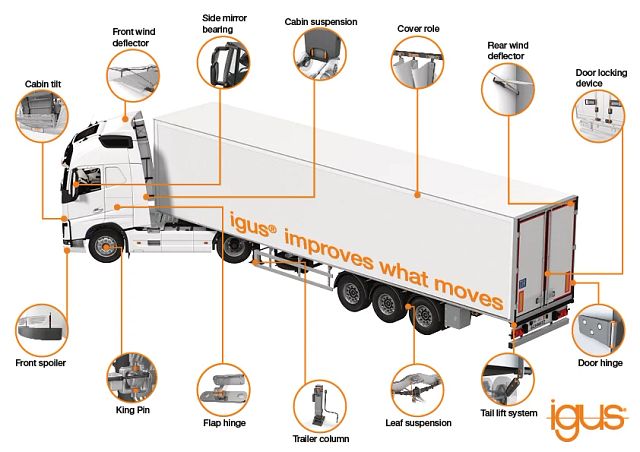 It is used for heavy-duty sliding applications such as trailer supports. Other truck applications for igus® products include door hinges, loading board walls, and tarpaulin rolls.